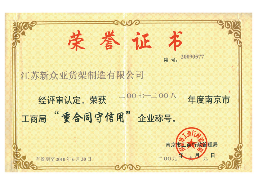 江蘇新眾亞貨架“優(yōu)秀誠信合作企業(yè)”